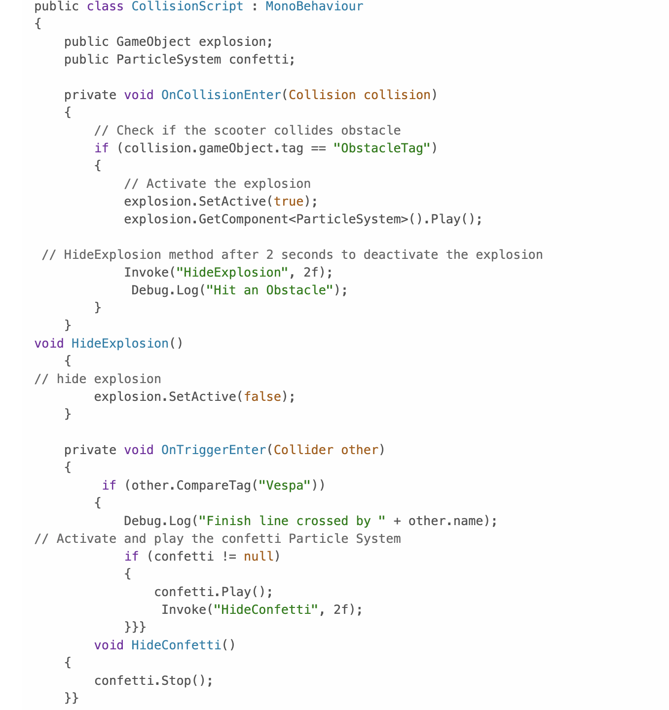 Next, I implemented various collision scripts to make the game environment interactive, allowing for dynamic responses when the scooter interacted with different elements. To keep things original, I created particle systems to create visual effects upon collisions. I also used audio source components on animal objects that trigger during collisions. Additionally, I added collision scripts on lamp posts in the scene to change colors as the scooter passed. by, enhancing the dynamic and interactive nature of the game world. You can find the script I used to achieve this below.