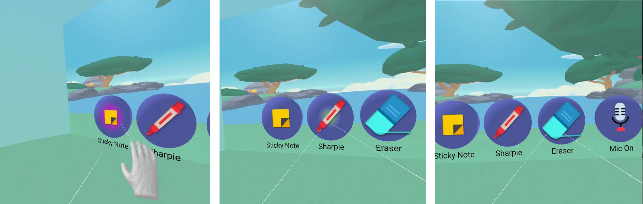 • The current design requires users to look at the back of their hands to activate the toolbar, which many found non-intuitive. Additionally, because the toolbar is anchored to the user’s view, it disappears with certain head movements, disrupting the workflow and causing frustration.