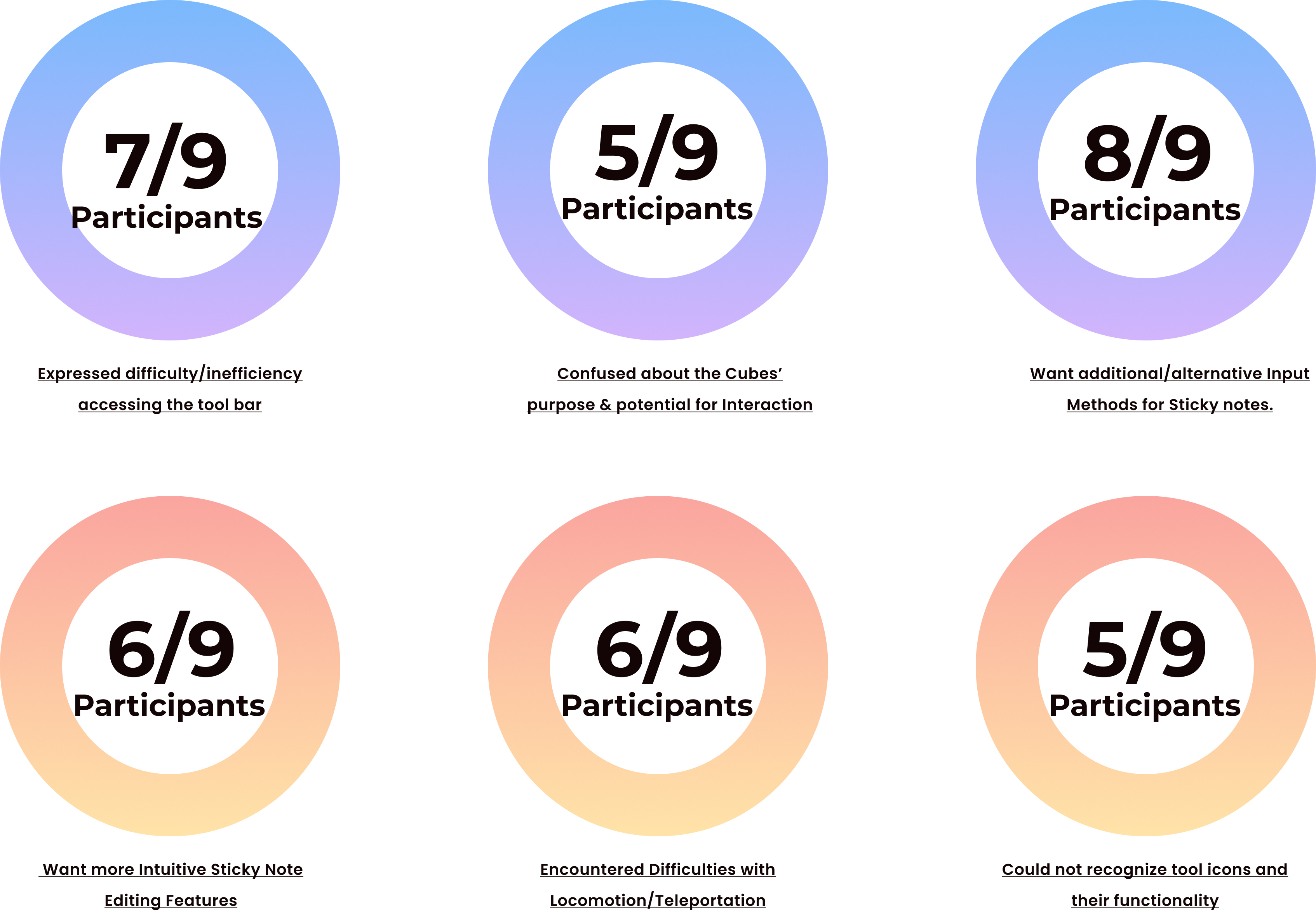 • These issues highlight the need for a more accessible and user-friendly toolbar design that remains consistently visible and is easier to access, enhancing the overall user experience in the virtual space.