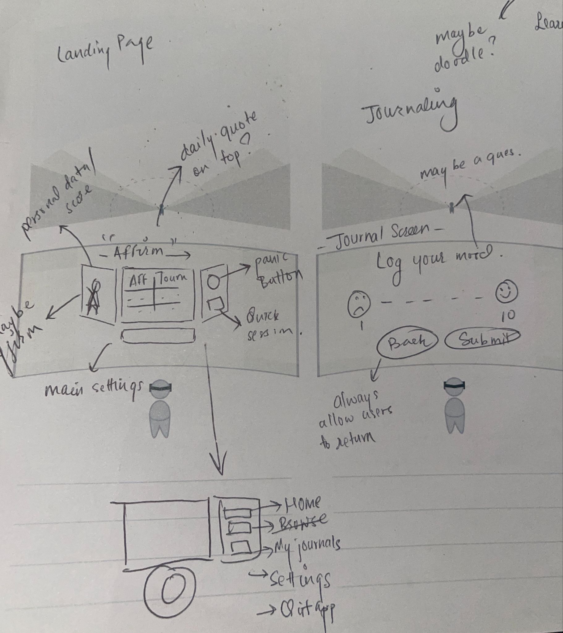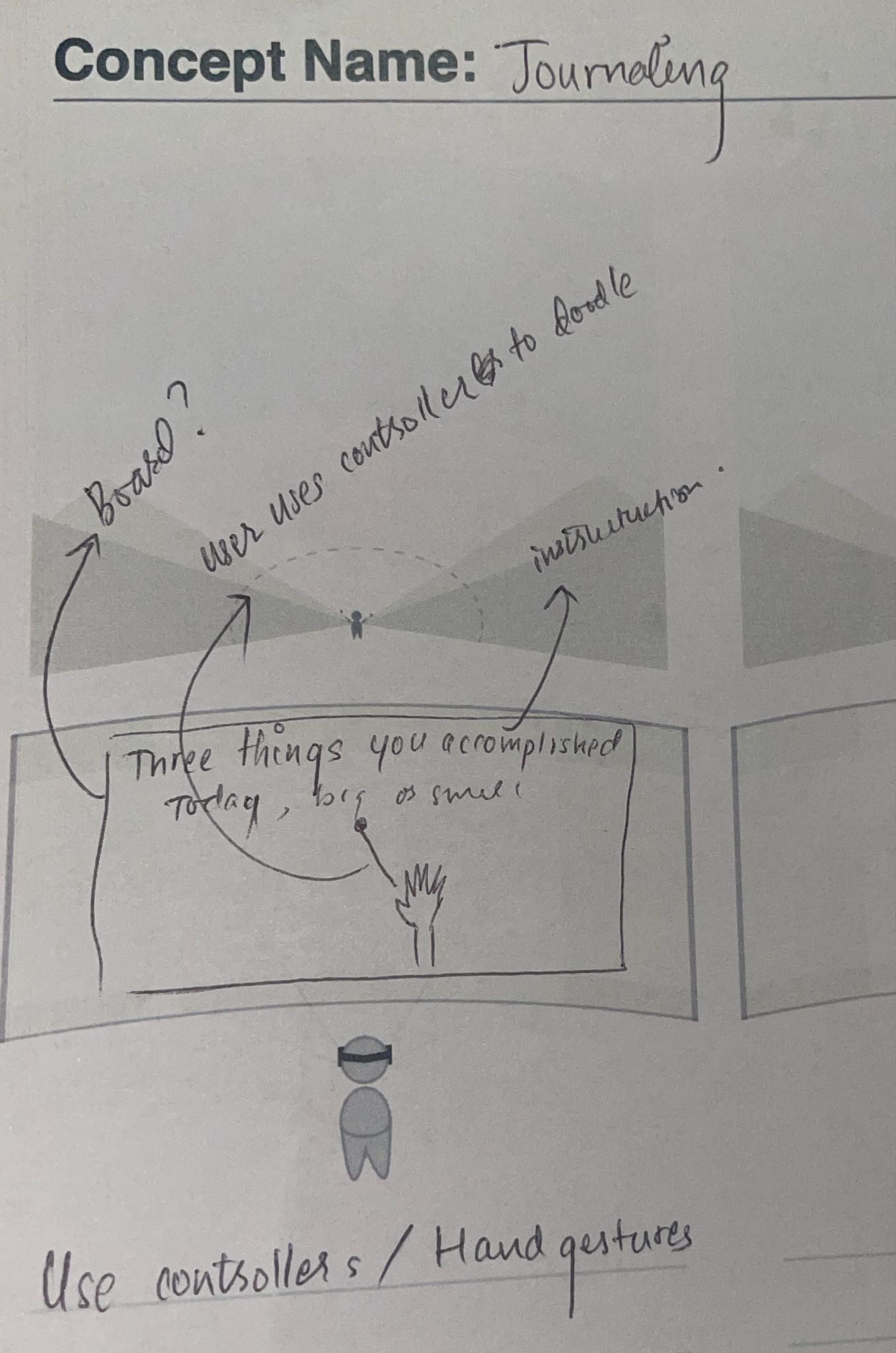 Based on user insights, I started sketching rough drafts of my prototype on paper, solely focusing on Journaling in VR.