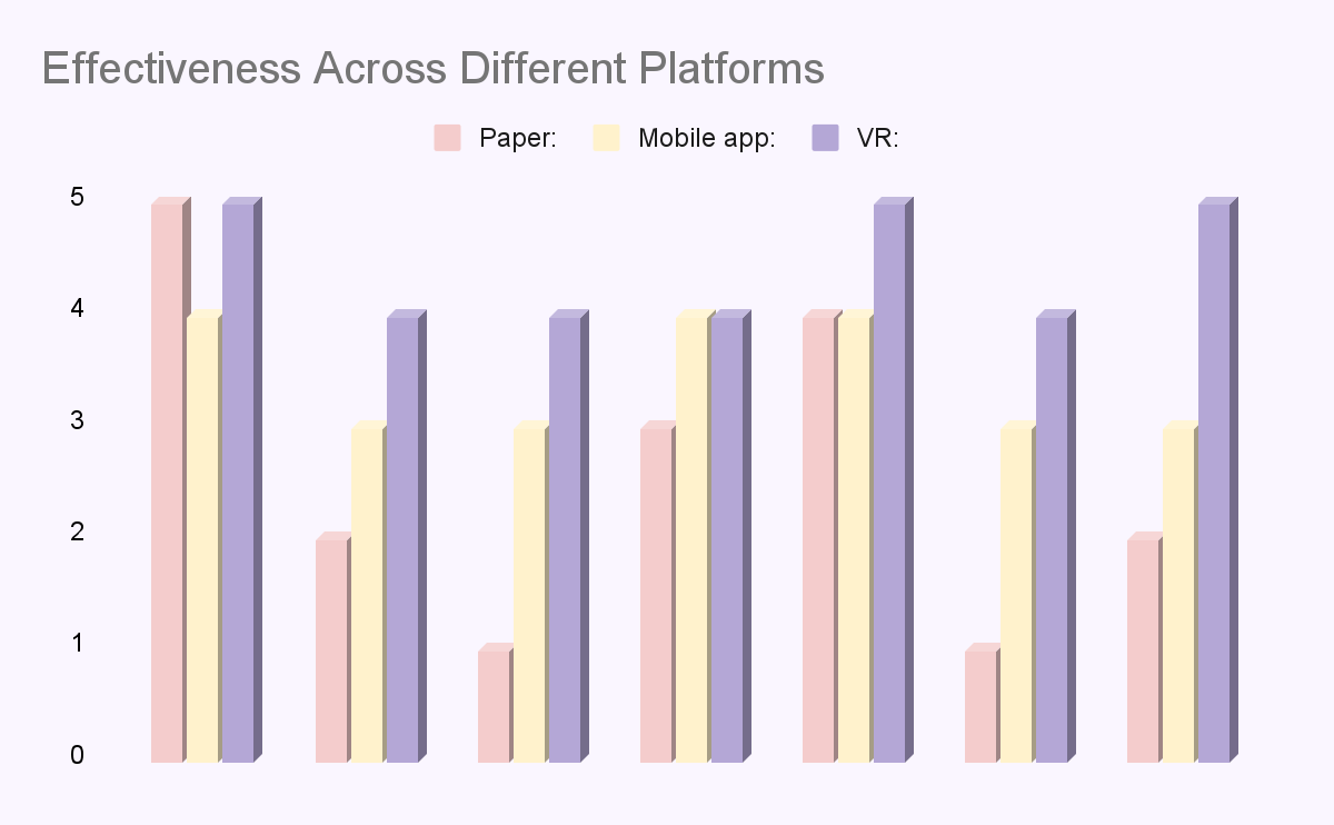 Compare experiences across VR, paper, and mobile to highlight VR's unique contributions.