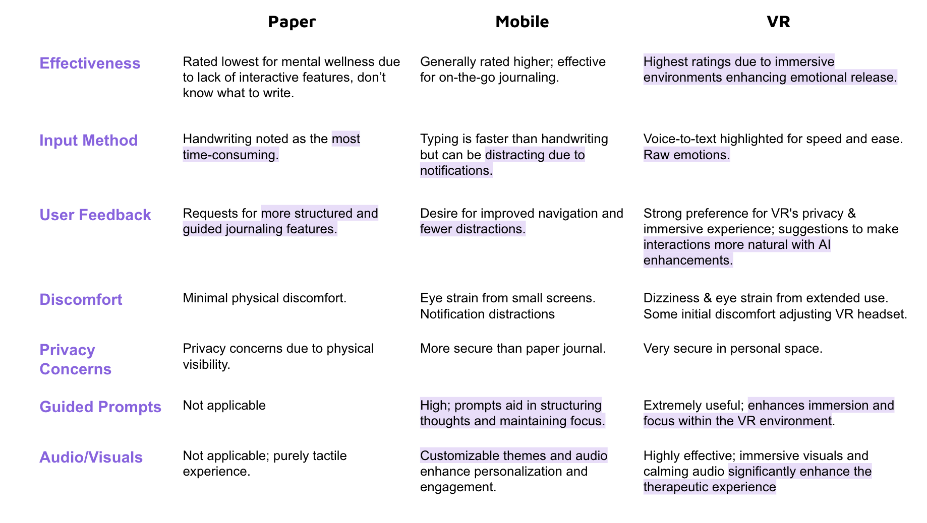 Therapeutic Potential: VR showed substantial promise in delivering more effective mental health interventions, particularly through personalized and immersive journaling experiences.